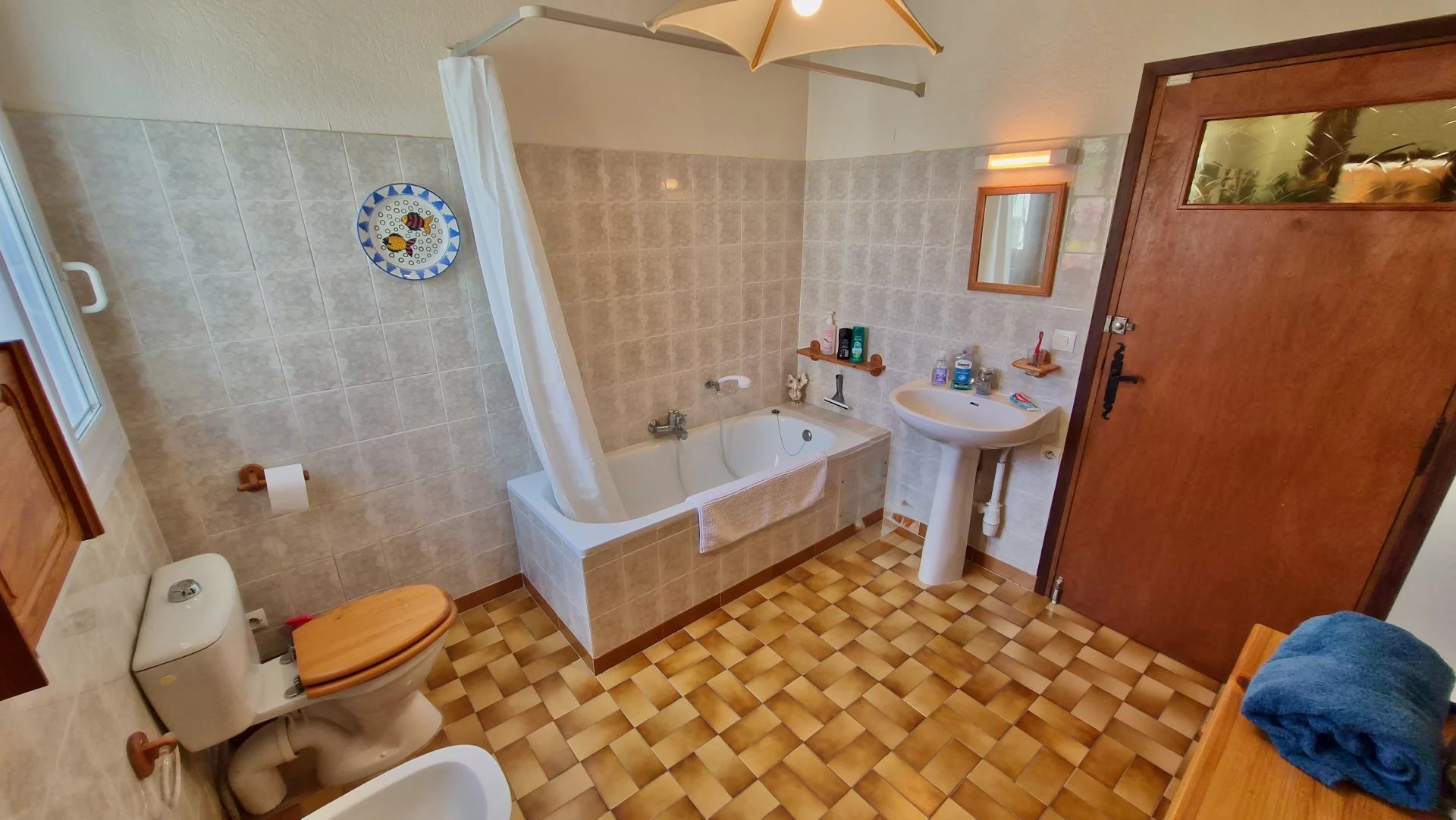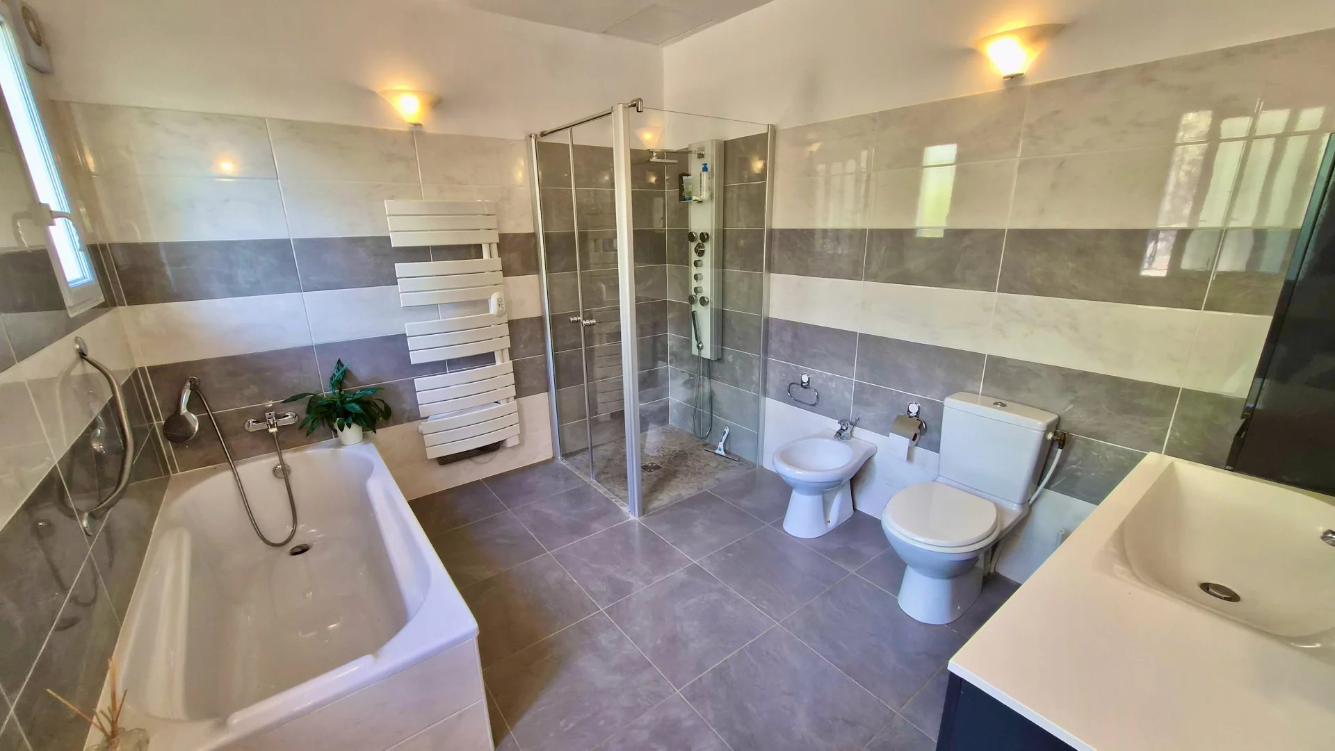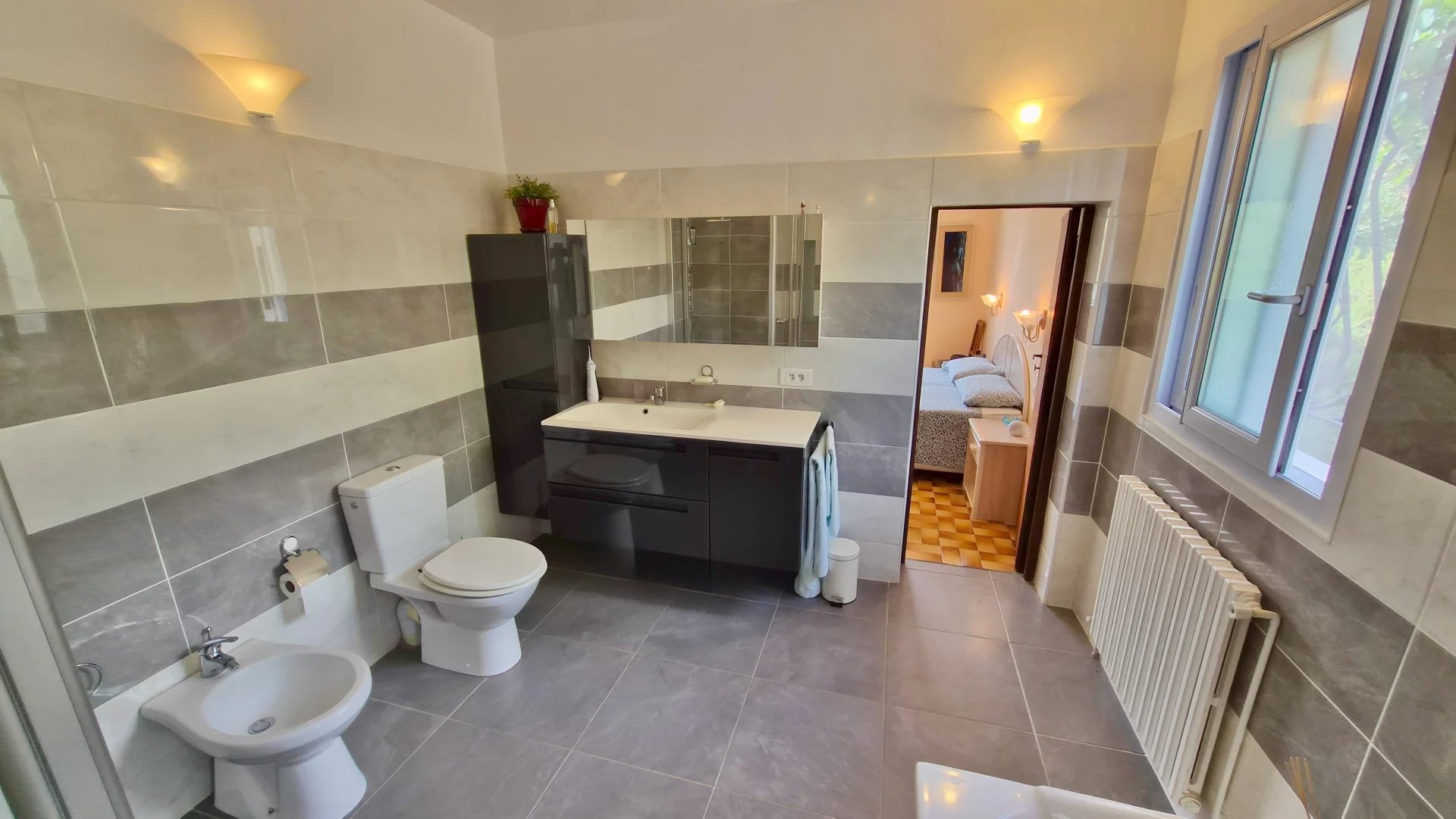 • Two Bathrooms – One with a bath, walk-in shower, WC, bidet, and washbasin; the other with bath and WC.